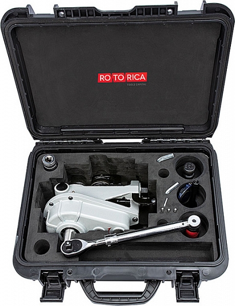 Ручной комбинированный желобонакатчик Rotorica RG-2M (Роторика РГ-2М) – портативное устройство для накатки желобков (канавок) на алюминиевых и углеродистых стальных трубах из алюминия и углеродистой стали Ø 1" – 6" sch. 10/40 и нержавеющих стальных трубах из нержавеющей стали Ø 1 1/4" – 6" sch. 10/40, толщиной стенки до 6 мм при монтаже водопроводных, отопительных, пожарных и промышленных трубопроводов без применения сварки. Подходит для выполнения небольших и среднеобъемных работ на строительной площадке. Может работать, как энергонезависимо, без подключения к источнику питания, так и с подключением через привод к резьбонарезным станкам или электрическим клуппам.