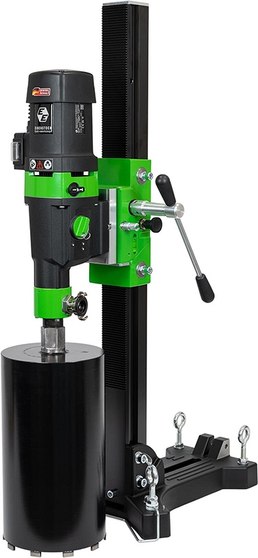 Установка с микроударом для алмазного бурения Eibenstock DSE 200 (Айбеншток ДСЕ 200) предназначена для сухого с микроударом и влажного сверления отверстий Ø 51 – 250 мм (оптимально Ø 51 – 202 мм), под углом до 45°, с подачей воды и без, в железобетоне, натуральном камне и асфальте при электромонтаже, сантехнических и отопительных работах в гражданском и промышленном строительстве.
